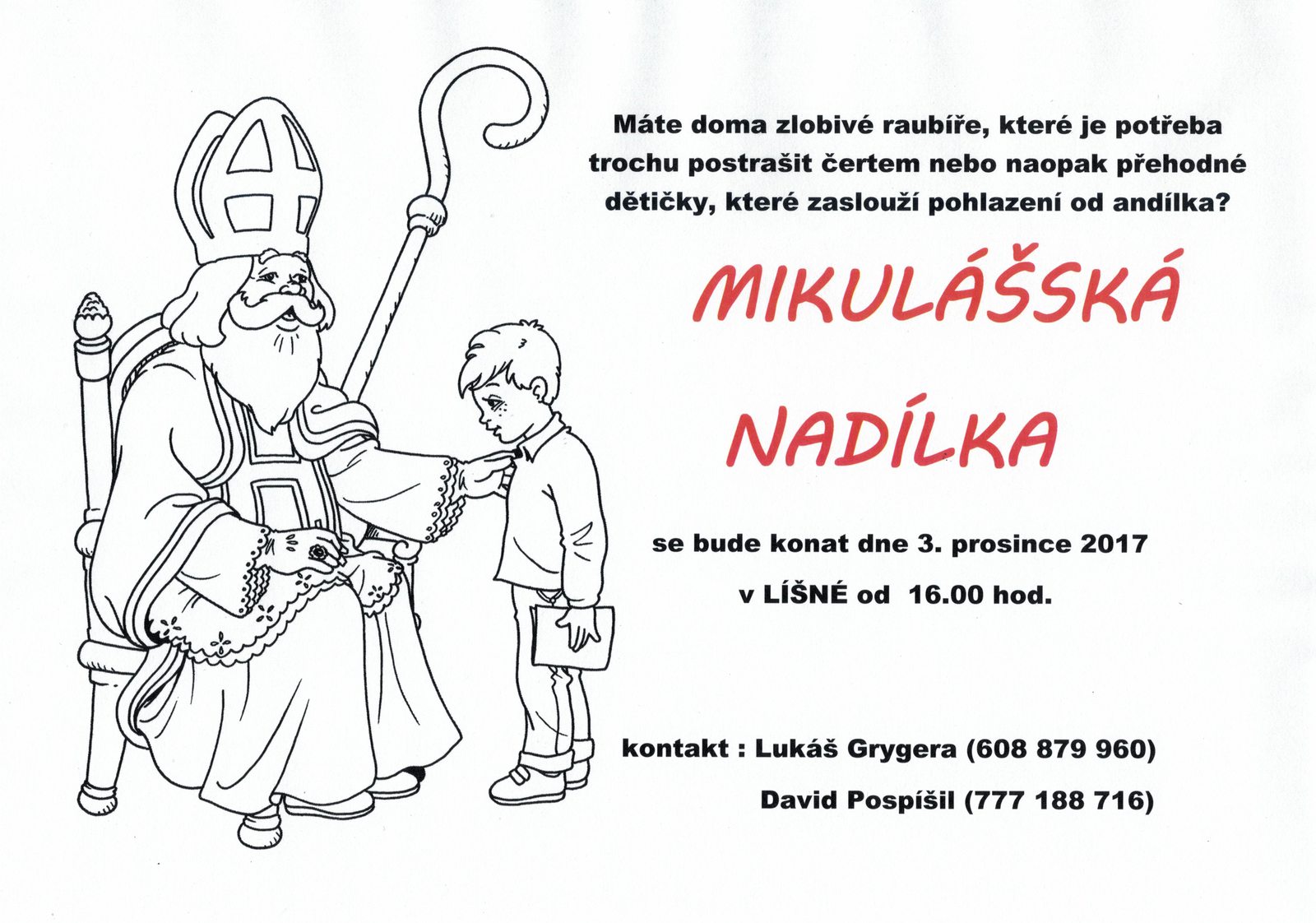 Kdo budete chtít, aby přišel Mikuláš i ke starším dětem, nahlaste se organizátorům. Stejně tak si návštěvu pro svoje děti objednejte pro děti, které tu budou u babičky nebo tety nebo mezi obyvatele Líšné zatím ještě nepatří z jakýchkoliv jiných důvodů. Oslovte prosím organizátory akce, aby se druž...ina na Vaše dítka přišla také podívat.